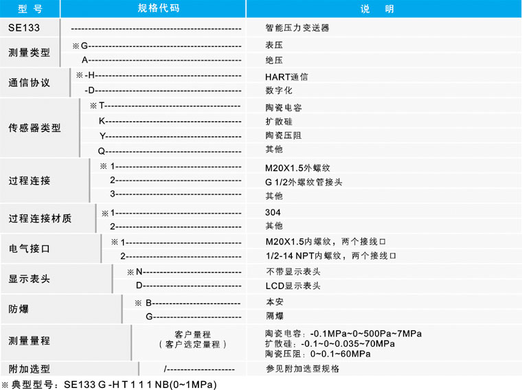 特点:·结构精巧,螺纹直接安装·可自由选配HART现场LED/LCD显示表头·变送器现场数据恢复·精度:0.1%FS、0.2%FS、0.5%FS·测量范围:-0.1MPa~60MPa·电源:12.5~45VDC·4~20mA叠加HART协议数字信号 SE133智能压力变送器外观流行,安装简单。可选多种过程连接。广泛应用于自动化工业中对液体、气体和蒸汽的测量。